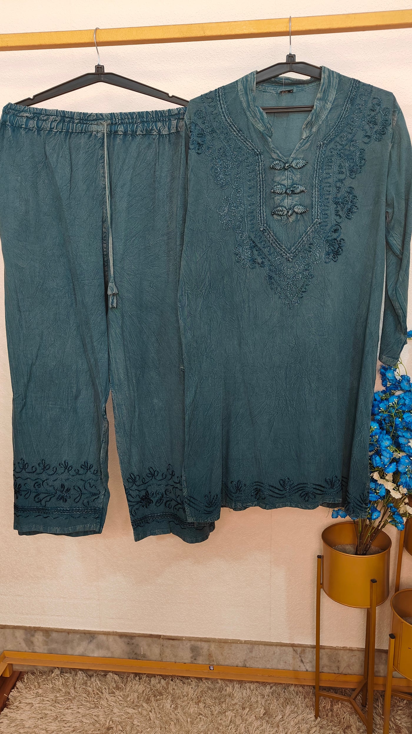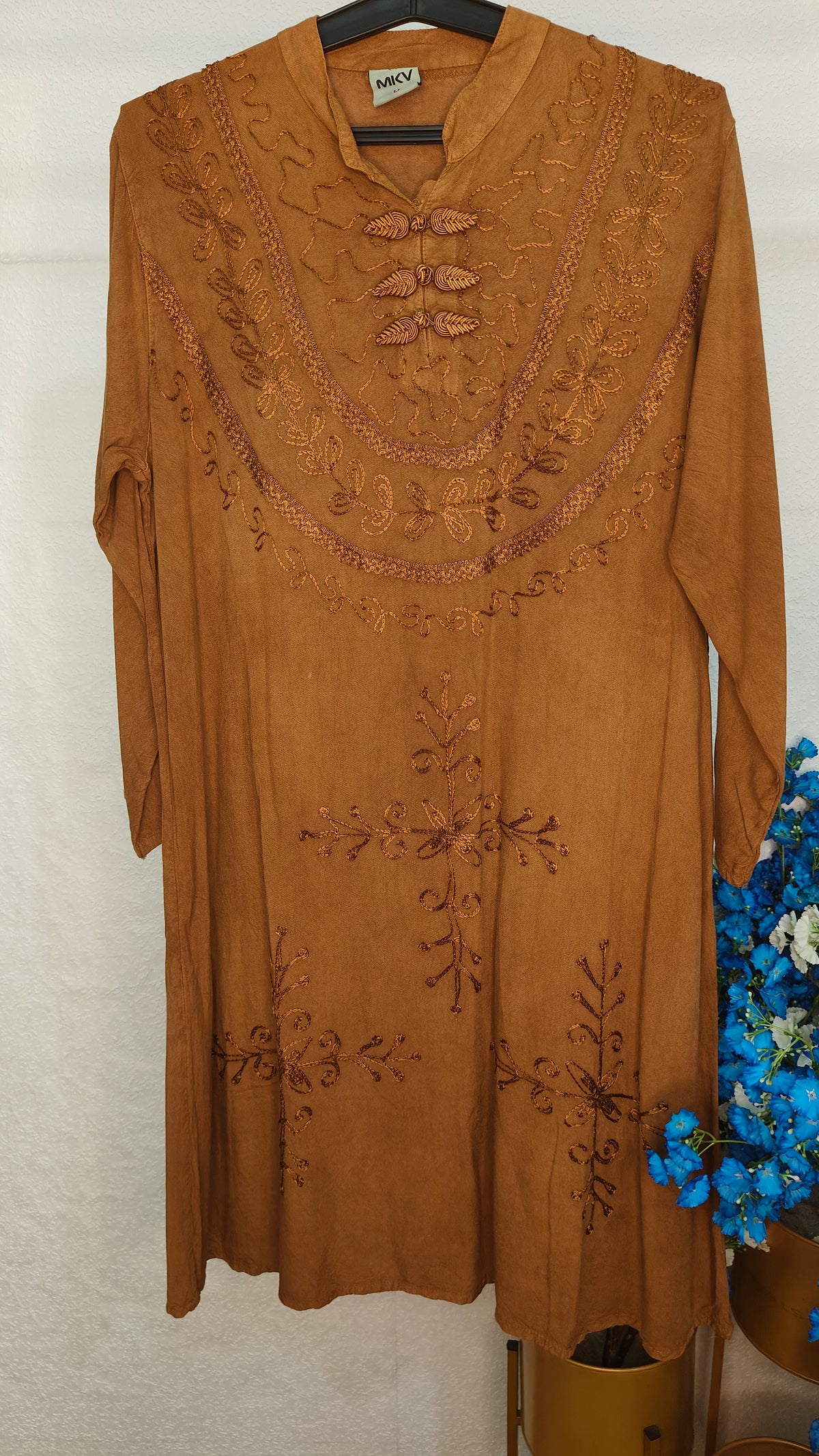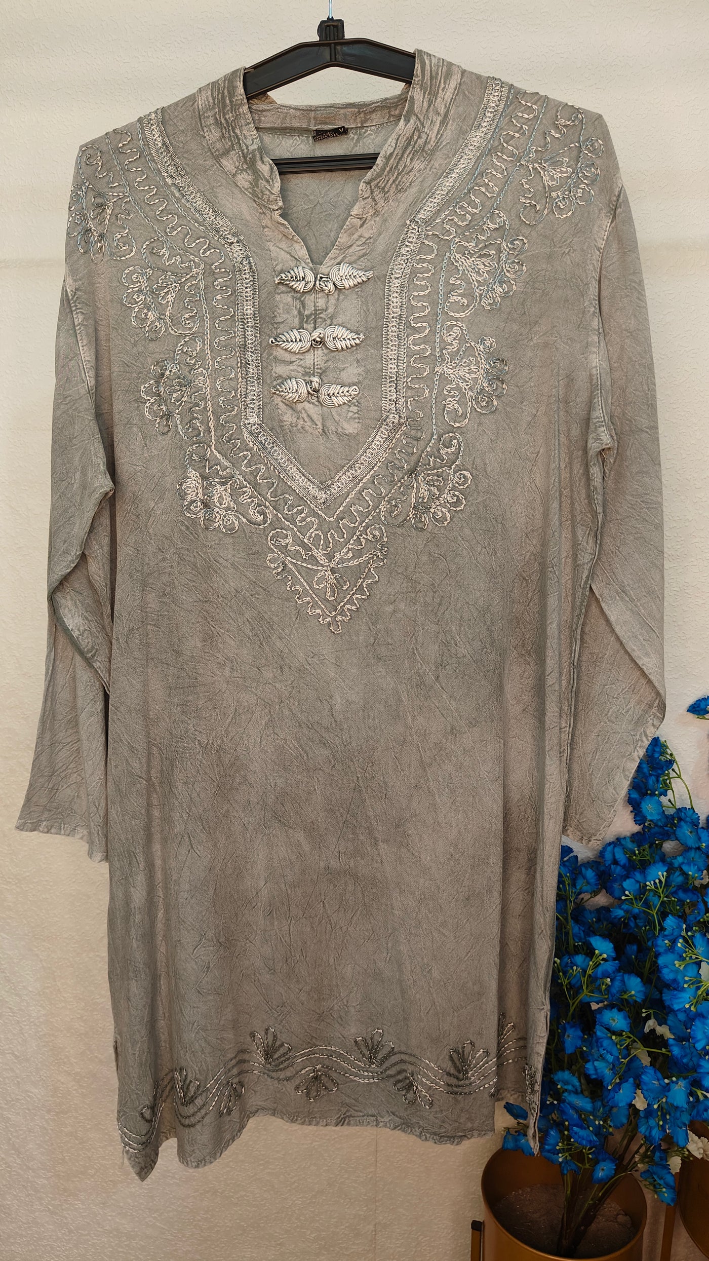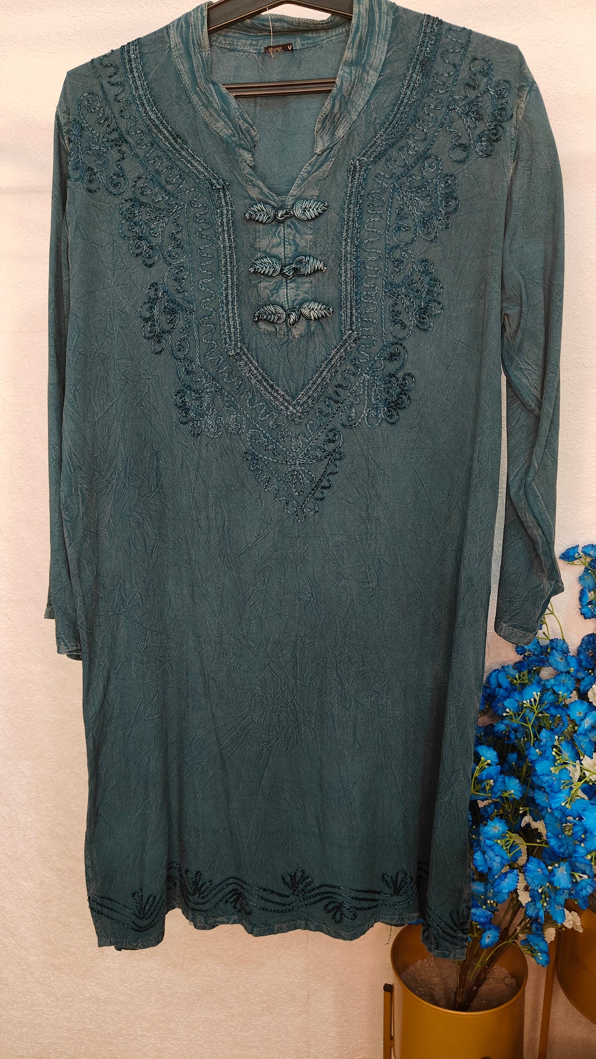 To keep your garment looking its best, we recommend gentle care. Machine wash cold with like colors or hand wash when needed. Use mild detergent and avoid bleach. Tumble dry on low or hang to dry for best results. Cool iron if needed, and avoid ironing directly on embellishments or prints. Always check the care label inside the garment for specific instructions.