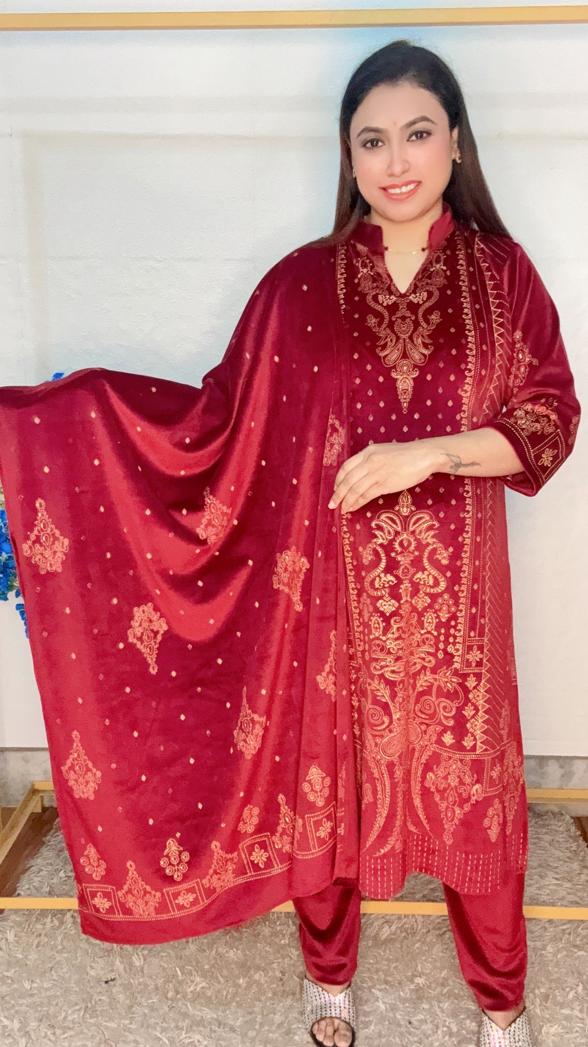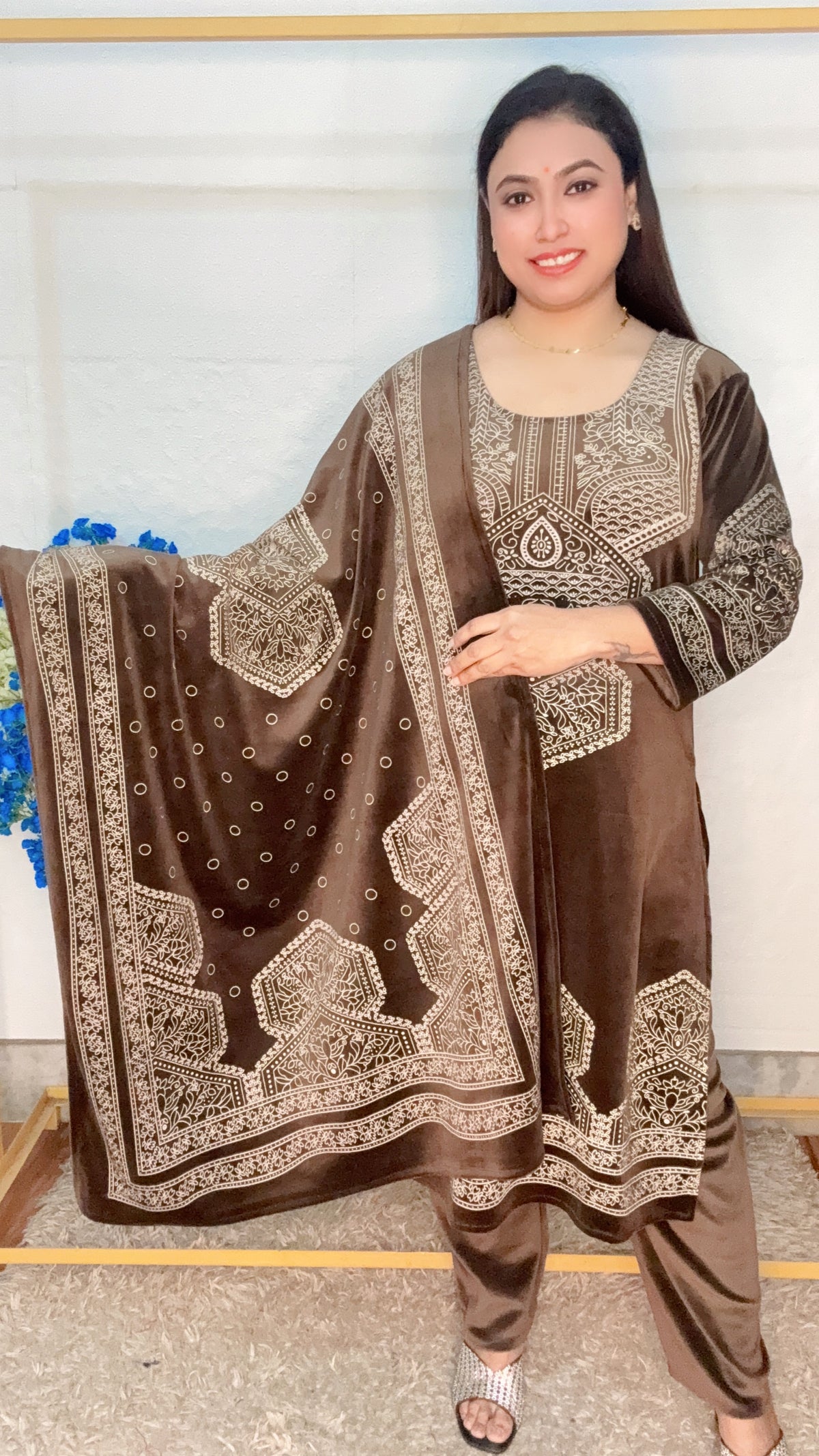 Soft Velvet Golden Print 3pcs Kurti Set
