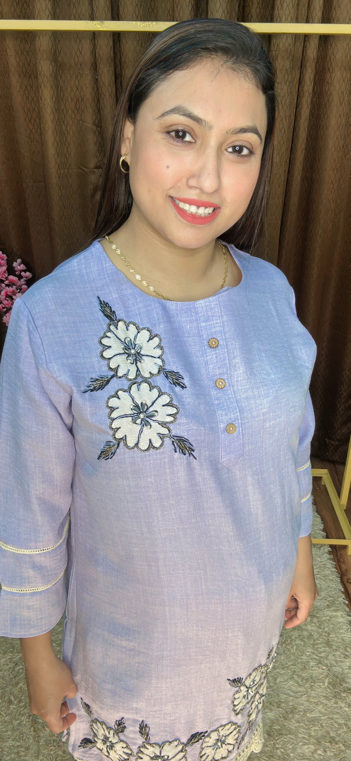 Two Flower Embroidery Khadi Cotton Cord Set - Free Size Till -44 / Parrot Green / Khadi Cotton