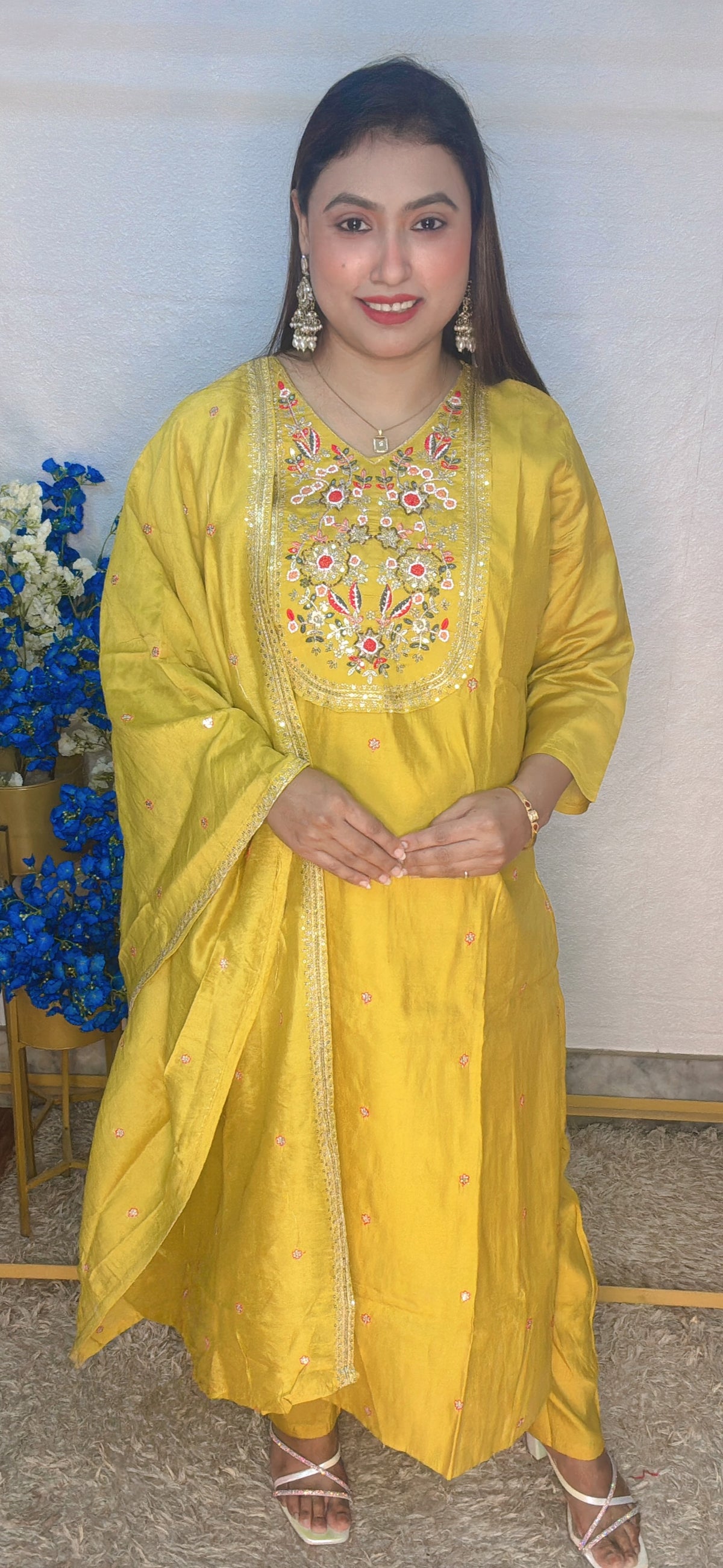 Radiate elegance and warmth in this stunning Sunehri Nazakat suit set. Crafted in a rich mustard-yellow hue, the ensemble features delicate floral embroidery on the yoke highlighted with hints of pink and green threadwork. The kurta, made from lustrous silk fabric, is paired with matching straight pants and a dupatta adorned with subtle sequin detailing and lace borders. Perfect for festive occasions, family gatherings, or traditional celebrations, this outfit beautifully blends comfort with timeless sophistication.